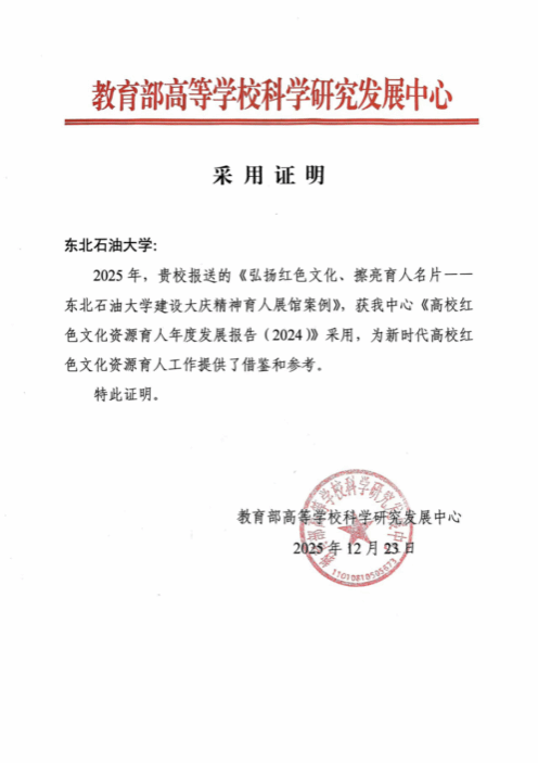 近日,我校大庆精神教育研究中心报送的《弘扬红色文化、擦亮育人名片 —— 东北石油大学建设大庆精神育人展馆案例》,获教育部高等学校科学研究发展中心《高校红色文化资源育人年度发展报告(2024)》采用。此次案例征集由教育部高等学校科学研究发展中心、高等学校中国共产党革命精神与文化资源研究中心共同组织,旨在深入学习党的二十届三中全会精神、全国教育大会精神,贯彻落实《教育强国建设规划纲要(2024-2035年)》,推进教育强国建设。